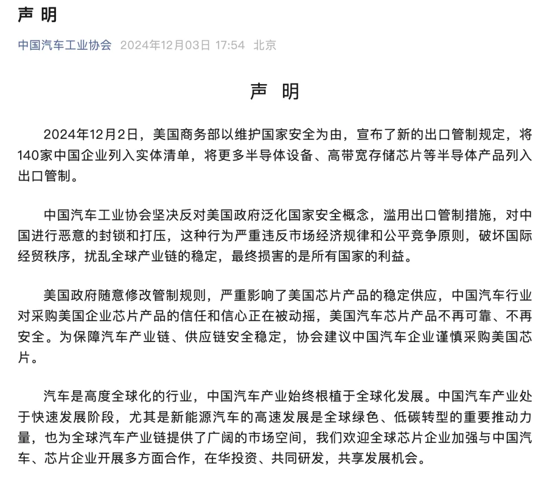 中国汽车工业协会于当晚发布声明表示,坚决反对美国政府泛化国家安全概念,滥用出口管制措施,对中国进行恶意的封锁和打压,这种行为严重违反市场经济规律和公平竞争原则,破坏国际经贸秩序,扰乱全球产业链的稳定,最终损害的是所有国家的利益。美国政府随意修改管制规则,严重影响了美国芯片产品的稳定供应,中国汽车行业对采购美国企业芯片产品的信任和信心正在被动摇,美国汽车芯片产品不再可靠、不再安全。为保障汽车产业链、供应链安全稳定,协会建议中国汽车企业谨慎采购美国芯片。中国半导体行业协会发布声明表示,随着美国出口管制措施不断加码,其反噬效应也在持续扩大,美国对华管制措施的随意性对美国企业也造成了供应链中断、运营成本上升等影响,影响了美国芯片产品的稳定供应,美国芯片产品不再安全、不再可靠,中国相关行业将不得不谨慎采购美国芯片。