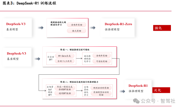 DeepSeek-R1 采用多阶段训练进一步提升推理能力。DeepSeek-R1 引入冷启动数据进 行多阶段训练,结合推理导向的 RL、拒绝采样和监督微调等方法提升推理性能。DeepSeek-R1 在 R1-Zero 的基础上引入冷启动数据(少量高质量人工标注的长链推理 示例)进行初步 SFT,随后分阶段结合强化学习 RL 训练: